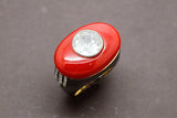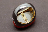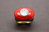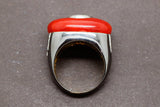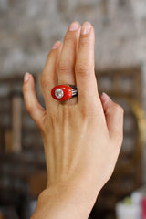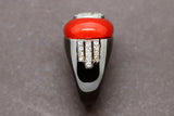 Bague ancienne de pur style et époque Art Déco. Un diamant rond taille ancienne d'environ 2,50 carats est serti en clos de platine avec millegrain au centre d'un plateau en cabochon ovale de cornaline rouge. Le corps de bague est en or jaune 750/1000e rhodié noir et habillé de chaque côté de motif d'escaliers Art Déco en platine pavés de petits diamants pour un poids total d'environ 0,25 carat.