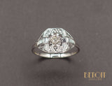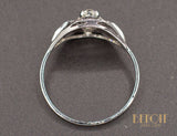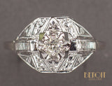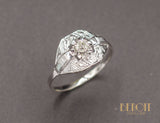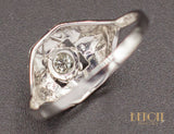 Bague Art Déco en or blanc 750/1000e dont la tête de bague est composée de différents motifs géométriques ouvragés et guillochés et est ornée au centre d'un diamant d'environ 0,15 carat serti sur chaton gaufré six griffes. Bijou de belle facture.