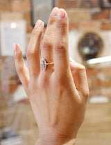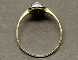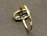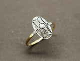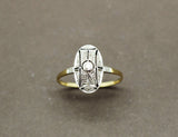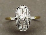 Bague Art Déco en or jaune 750/1000e réhaussé d'or blanc 750/1000e. Composée en son centre d'un plateau ovale au motif Art Déco finement ajouré au centre duquel un diamant taille ancienne est serti dans un clos. Le reste du motif est serti de petits diamants taille rose et d'un effet de trompe l'oeil pour donner l'impression d'un pavage complet.