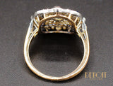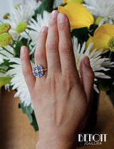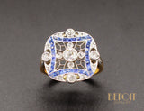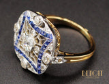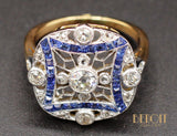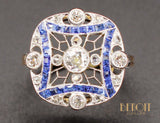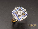 - Pierres : Diamant central ~0,20 ct / saphirs ~0,30 ct au total / diamants taille ancienne ~0,20 ct au total / diamants taille rose ~0,10 ct au total