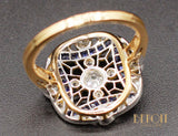 Bague Art Déco en or blanc 750/1000e, dont la tête, en platine, est composée d'un plateau de forme coussin richement ajouré et ouvragé. Au centre, un diamant taille ancienne d'environ 0,20 carat est serti en clos, encadré d'un ajourage rappelant une toile d'araignée et de petits diamants taille rose en sertis clos. Puis, un cadre de calibrés de saphirs d'un beau bleu lumineux sépare l'ajourage de parties pavées de diamants taille rose. Enfin quatre diamants taille ancienne (environ 0,20 carat au total) sont sertis en clos aux points cardinaux du plateau. Anneau ouvragé d'une raynure, rehaussé de platine de chaque côté de la tête de la bague et serti de deux petits diamants taille rose. Riche travail de millegrain.