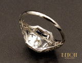 Bague dôme en platine datant de la période Art Déco sertie d'un diamant taille ancienne au centre d'un décor géométrique, de formes repercées et ornée de chaque coté de deux saphirs navettes. De part et d'autre, lignes de saphirs calibrés venant souligner les volumes. Travail de gravures sur la monture riche et typique de la période.
