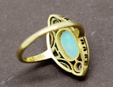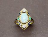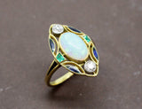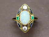 Bague ancienne Art Nouveau signée Henri Dubret en or jaune 750/1000e ornée en son centre d'une opale sertie en clos, accompagné de deux émeraudes taille trapèze et de deux diamants taille ancienne d'environ 0,10 carat chacun sertis sur réhauts de platine. Des décors repercés et émaillés bleus viennent orner le plateau de formes géométriques et sur la tranche du plateau de délicats feuillages émaillés noir. Le corps de bague est souligné par de fin triangles émaillés noirs et est signé sur la tranche "Dubret" et du numéro "932 622". Bijou en très bon état.