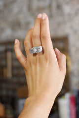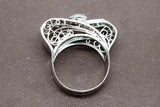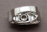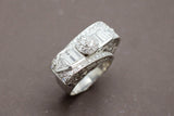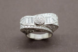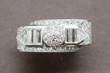Bague Art Déco type cocktail, volumineuse, en platine. Esthétique d'inspiration "noeud", avec un petit dôme pavé de diamants au croisement de deux volumes arrondis formant les "boucles", également pavés de diamants. De part et d'autre du dôme central, deux éléments en forme de flèches sont sertis de diamants baguettes et terminés par des diamants triangles. Sur le profil de la bague, les volumes sont délicatement ajourés de motifs géométriques Art Déco.