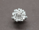 Bague cocktail en or blanc 750/1000e ornée en son centre d'un diamant d'environ 0,30 carat serti sur chaton gaufré 6 griffes, placé en hauteur par rapport à l'entourage, fait d'éléments types "pétales" sertis de diamants, avec en alternance des diamants seuls sur chatons 4 griffes. Panier ajouré fait d'arabesques, travaillé en fils. Corps de bague en fils ronds, typique des années 1950. Bijou volumineux.