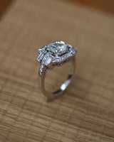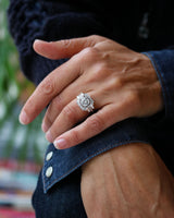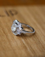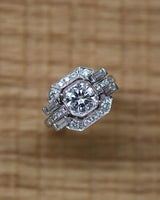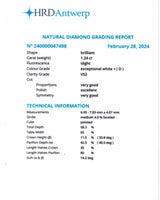Bague Création Benoît Joaillier en or blanc 750 millièmes, dont le centre est serti d'un diamant taille brillant 1.24 ct certifié HRD N°240000047498 serti en clos et grains dans un carré pans coupés. Entourage de diamants sertis en grains, rehaussé de millegrain. Corps de bague de section carré dont les palmettes sont pavées de diamants taille brillant et réhaussées de part et d'autre d'un diamant taille baguette. Panier ajouré.