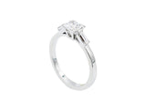 Bague solitaire Création Benoit Joaillier en or blanc 750/1000e, ornée en son centre d'un diamant taille princesse certifié E-VVS1, serti par quatre griffes en coins, et épaulé de deux baguettes de diamants serties en demi clos.