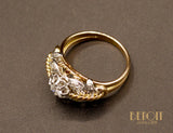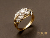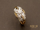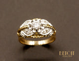 Bague en or rose 750 millièmes sertie en son centre d'un diamant taille brillant sur chaton gaufré de platine, orné d'un décor de fils et torsades en or rose et de feuilles de platines serties de diamants taille rose. Corps en double fils demi-jonc.