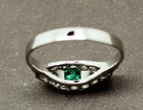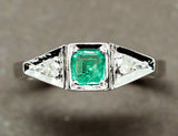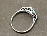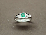 Bague ancienne Art Déco en or blanc 585/1000e, ornée en son centre d'une émeraude taille émeraude d'environ 0,20 carat, sertie en grain dans un carré épaulé de deux formes triangulaires sertie chacune d'un petit diamant. Les reliefs et la forme générale de la bague sont typiquement Art Déco. Son panier est composé de cercles finement ajourés.