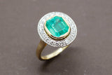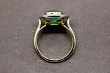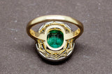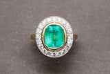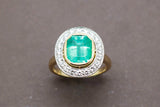 Bague en or jaune 750/1000e, avec en son centre une émeraude taille émeraude d'environ 3 carats d'un vert vif, en serti clos d'or jaune, accompagné d'un entourage de diamants taille brillant sertis en grains sur une couronne de platine. Le panier de la bague est ajouré de motifs géométrique.
