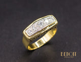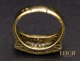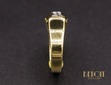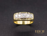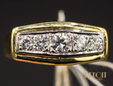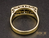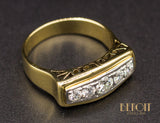 Bague jarretière Art Déco en or jaune 750/1000e, ornée de cinq diamants taille moderne de taille dégressive, sertis sur une bande de platine posée sur un plateau d'or jaune. Faces du bijou décorées de repercés, corps de bague plat.