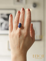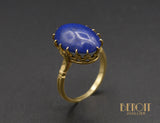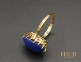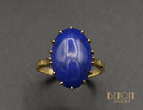 Bague en or jaune 750 millièmes, ornée en son centre d'un cabochon de lapis lazuli de couleur uniforme, serti sur griffes décorées. Panier travaillé en couronne. Corps de bague simple.