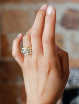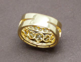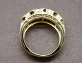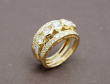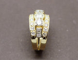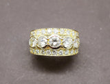 Bague d'occasion en or jaune 750/1000e, composée de deux anneaux sertis jusqu'à la moitié de petits diamants, entre lesquels 5 diamants ronds, épaulés de 6 diamants baguette, sont sertis en clos et demi-clos.