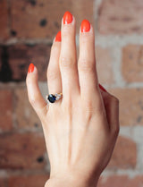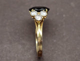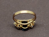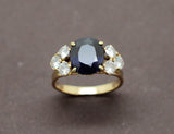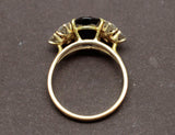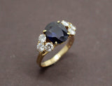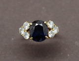 Bague d'occasion en or jaune 750/1000e ornée en son centre d'un saphir bleu nuit ovale d'environ 3 carats, serti sur 4 griffes. De chaque côté de la pierre, 3 diamants d'accompagnement sont également sertis sur griffes.