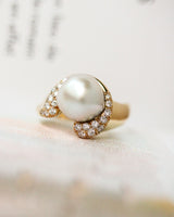 Bague de type jonc en or jaune 750 millièmes ornée en son centre d'une perle de culture bouton posée au centre d'une forme ronde ouverte en partie pavée de diamants taille brillant. Le corps de bague est évasé sur le haut et souligne dans une jolie torsion la tête de bague. Le reste du corps est plat et large. Bijou en très bon état.