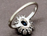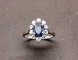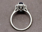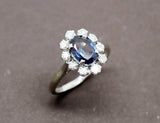 Bague en or blanc 750/1000, ornée en son centre d'un saphir bleu ovale d'environ 1 carat, entouré de 10 diamants taille moderne, le tout serti sur griffes de platine. Anneau fin, bague légère.
