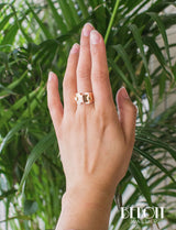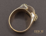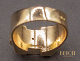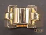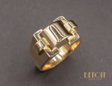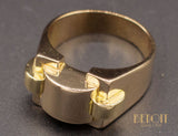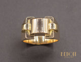 Bague Tank en or rose 750/1000e composée de différents volumes géométriques dont les deux plus petits cylindres sont en or jaune 750/1000e. Bijou d'époque et dans le pur style Art Déco moderniste.