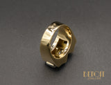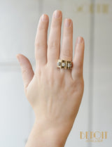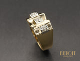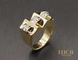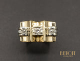 Bague en or jaune 750/e de style Tank, dont le centre est traversé d'une bande rehaussée d'or blanc et pavée de Diamants : un taille ancienne au centre et quatre taille moderne sur les extérieurs. Cette bande est coupée en trois partie par la base qui remonte en " V" . Corps de bague large.