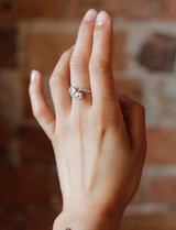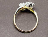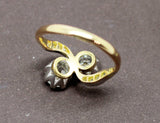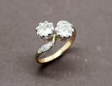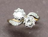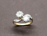 Bague ancienne style "Toi et Moi" or jaune 750/1000e ornée de 2 diamants taille ancienne d'environ 0,60 carat chacun sur griffes de platine. De part et d'autre, l'anneau de la bague fin et délicat forme deux volutes d'or réhaussé de platine, serties de petits diamants pour un poids total de 0,08 carat environ.