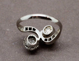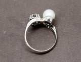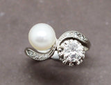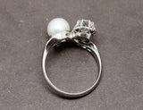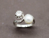 Bague ancienne "Toi et moi" en platine, ornée d'une perle blanche supposée fine et d'un diamant d'environ 0,45 carat serti sur un chaton gaufré. Les deux volutes qui forment l'anneau, au centre, sont empierrées de petits diamants sur un poids total d'environ 0,05 carat.