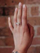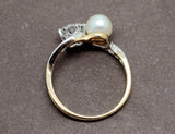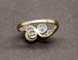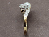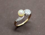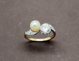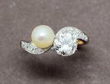 Bague ancienne des années 1910, de type "toi et moi", mettant côte à côte une perle fine sur socle d'or jaune et un diamant taille ancienne d'environ 0,95 carat serti sur chaton 8 griffes de platine. De part et d'autre, l'anneau de la bague prend la forme de volutes, serties de diamants sur réhauts de platine. Le reste de l'anneau est en or jaune 750/1000e.