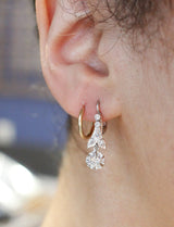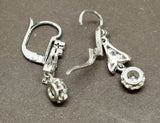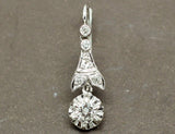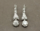 Boucles Art Déco en or blanc 585/1000e, composées chacune d'un diamant taille ancienne d'environ 0,20 carat serti dans un chaton gaufré articulé à un motif Art Déco ajouré et serti de petits diamants taille ancienne, et lui-même articulé à un petit serti clos avec diamant attaché au système pour oreilles percées.