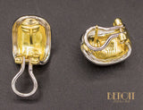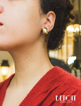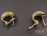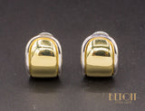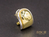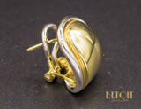 Boucles d'oreilles en or jaune et blanc 750/1000e, au style simple et épuré. Un aplat d'or jaune bombé et souligné d'un fil rond épais d'or blanc vient épouser le lobe et son système alpa est sécurité par une raquette, maintenant le bijou bien en place. Bijou chic et dont le style vintage correspond à la tendance du moment.