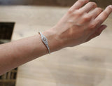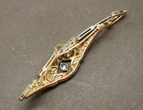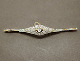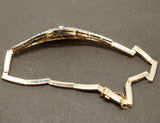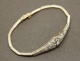 Bracelet Art Déco en or jaune 750/1000e réhaussé d'or blanc 750/1000e, serti en son centre d'un diamant taille ancienne d'environ 0,10 carat en clos, autour duquel un motif typiquement Art Déco ajouré et pavé de diamants taille rose est rattaché à des maillons chaîne également réhaussés d'or blanc. Fermoir cliquet sécurisé par une petite chaîne fixe.