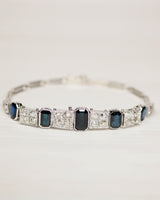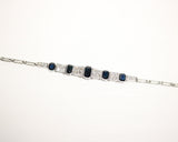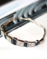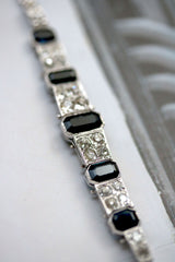 Bracelet articulé en platine au design géométrique en fuite, typique de l’Art Déco. Le motif central alterne harmonieusement cinq saphirs d’un bleu profond, sertis clos millegrain, et six mailles en forme de trapèze ornées de diamants taille ancienne coussin, également sertis clos millegrain. Les extrémités du motif sont prolongées par une chaîne ajourée en mailles rectangulaires finement repercées. Le fermoir sécurisé, doté d’un huit de sécurité, est en or gris 750 millièmes. Un bijou emblématique de l’élégance Art Déco, en bon état.
