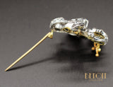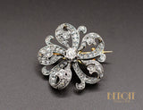Broche ancienne en or jaune 750/1000e réhaussée d'argent. De forme fleur, elle est ornée en son centre d'un diamant coussin taille ancienne d'environ 0,40 carat serti sur six griffes d'argent. Le reste du bijou est serti de diamants taille rose pour un poids d'environ 1 carat au total.