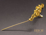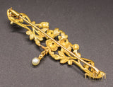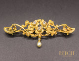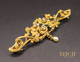 Broche de style et d'époque Art Nouveau, en or jaune 750/1000e, représentant des courbes de branchages et de feuilles de rosier, avec en son centre trois roses d'or dont le centre de chacune est figuré par un diamant taille rose serti sur clos de platine. Au dessous du motif, une perle blanche fine de forme baroque est suspendue.