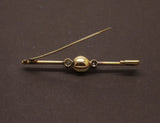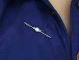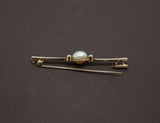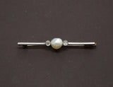 Broche barrette en or jaune 585/1000e (14K) réhaussé de platine datant des années 1930, période Art Déco. Sa perle fine, d'origine, est mise en valeur par deux diamants taille ancienne ovales d'environ 0,20 carat chacun, sertis en clos millegrain.