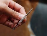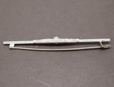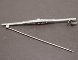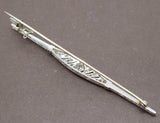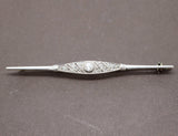 Broche barrette en or blanc 750/1000e et platine. Un motif en amande, placé au centre de la barrette, est ajouré, ouvragé de millegrain et serti de diamants taille rose, entourant un diamant principal d'environ 0,23 carat en serti clos. Les flancs de la broche sont entièrement ouvragés de gravures dans le pur style Art Déco.