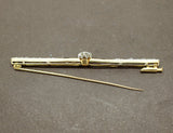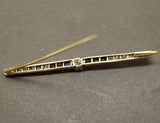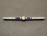 Broche barrette des années 1920, en or jaune 750/1000e réhaussée de platine. Sertie en son centre d'un diamant taille ancienne d'environ 0,30 carat dans un chaton gaufré, épaulé de saphirs bleu nuit calibrés, suivis de diamants taille ancienne dégressifs sertis en grains. Travail de millegrain.