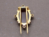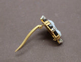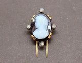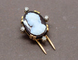 Clip ou bijou de col en or jaune 750/1000e datant de la fin du XIXe siècle. Un camée en agate est serti sur double griffes plates et est ornée de quatre diamants taille rose pour un poids total d'environ 0,06 carat sertis sur griffes de platine. Système broche à deux tiges.