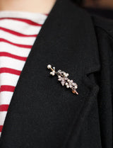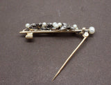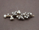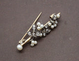 Broche vintage du XIXe siècle en or jaune 750/1000e représentant une tige ou une canne à pommeau, terminée par une perle fine, autour de laquelle s'enroule une branche de lierre en argent ouvragée et agrémentée de perles fines et dont les feuilles sont serties de diamants taille rose.