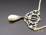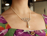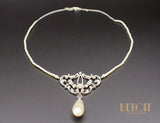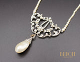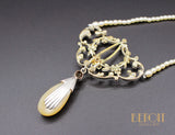 Collier ancien, orné au centre d'un élément ajouré représentant des volutes, des rubans et une couronne de fleur, en or jaune 750/1000e réhaussé d'argent, entièrement serti de diamants taille rose et taille ancienne (~0,50 carat au total) et agrémenté de 5 perles fines blanches. Sous cet élément est articulé un pendent en or jaune 750/1000e et argent, serti d'un diamant "Brown" taille ancienne d'environ 0,40 carat, surplombant une forme d'éventail sertie de diamants taille rose (environ 0,15 carat au total), fixant un élément en nacre de forme poire. Le tour de cou est composé d'une partie en perles fines blanches de dimensions décroissantes enfilées sans noeuds, puis d'une partie de chaîne en or blanc 750/1000e. Fermoir cliquet récent en or blanc 750/1000e et chaîne de sécurité récente en or blanc 750/1000e également. Bijou rare, en très bon état, mais fragile.