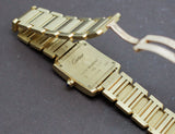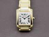 Montre d'occasion pour femme, signée "Cartier", de la collection Tank Française, entièrement en or jaune 750/1000e. Signée en rouge "30 ans". Bracelet d'origine, boucle déployante signée.