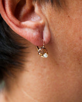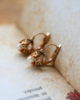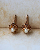 Paire de boucles d'oreilles dormeuses en or rose 750/e dont le centre est orné d'une perle de culture délicatement posé sur un panier composé de volutes. Bijou délicat en très bon état.