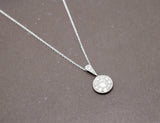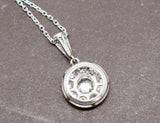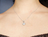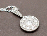Pendentif Art Déco en platine, composé d'un disque serti de diamants en trompe l'oeil, bordé d'un liseré de millegrain. La bélière, en forme de goutte, est également sertie de diamants et ouvragée de millegrain. Bijou délicat et épuré. Pendentif monté sur une chaîne en or blanc 750/1000e neuve.