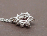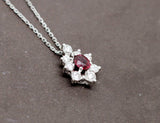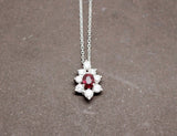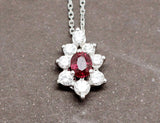 Pendentif en or blanc 750/1000e d'occasion, orné d'un rubis ovale rouge d'environ 0,45 carat serti sur trois griffes, accompagné d'un entourage de diamants de différentes dimensions, pour un poids total d'environ 0,50 carat, sertis sur griffes également. L'ensemble donne une forme de fleur allongée. Proposé sur chaîne neuve en or blanc 750/1000e.