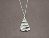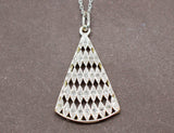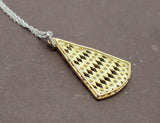 Pendentif de forme triangulaire, ajouré et ouvragé de petits éléments de platine en losange, formant un quadrillage. Sur chaque petit losange est serti un petit diamant taille rose. Le dos du pendentif et la structure sont en or jaune 750/1000e. Pendentif proposé sur une chaîne neuve en or blanc 750/1000e.