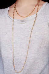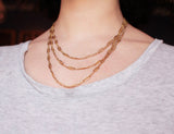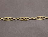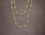 Sautoir ancien en or jaune 750/1000e, composé de maillons ajourés et ouvragés de filigrane, reliés entre eux par de petits anneaux ovales. Peut se porter en 2, 3 ou 4 rangs. Fermoir mousqueton récent.