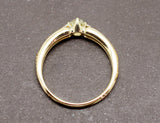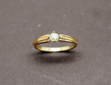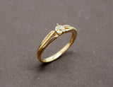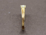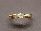 Bague solitaire en or jaune 750/1000e, ornée en son centre d'un diamant taille ancienne coussin d'environ 0,20 carat serti sur 4 griffes. De part et d'autre de la la pierre, l'anneau est ouvragé de motifs de torsade.