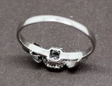 Bague solitaire ancienne d'époque et de style Art Déco, en or blanc 750/1000e, ornée en son centre d'un diamant taille ancienne d'environ 0,20 carat serti sur un chaton gaufré 4 doubles-griffes épaulé de formes géométriques lisses. Anneau simple et fin.