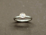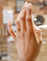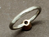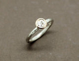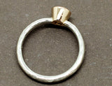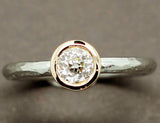 Solitaire d'occasion de style contemporain composé d'un diamant taille ancienne d'environ 0,35 carat serti dans un clos haut d'or jaune 750/1000e, ornant un anneau jonc simple d'or blanc 750/1000e martelé.