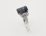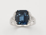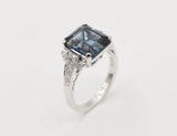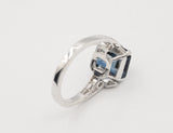 Solitaire Création Benoît Joaillier en or blanc 750 millièmes orné en son centre d'une belle Topaze Blue London, taille émeraude de 5,84 carats, sertie dans un chaton 4 griffes épaulé de chaque côté d'un motif Art Déco pavé de diamants. Corps de bague section carrée.